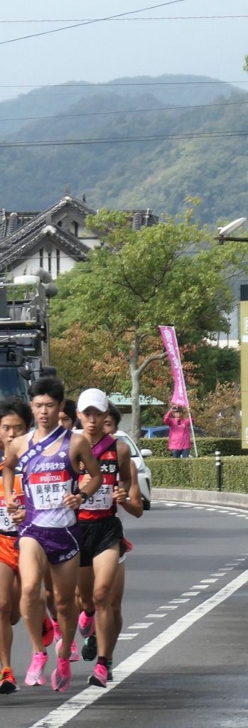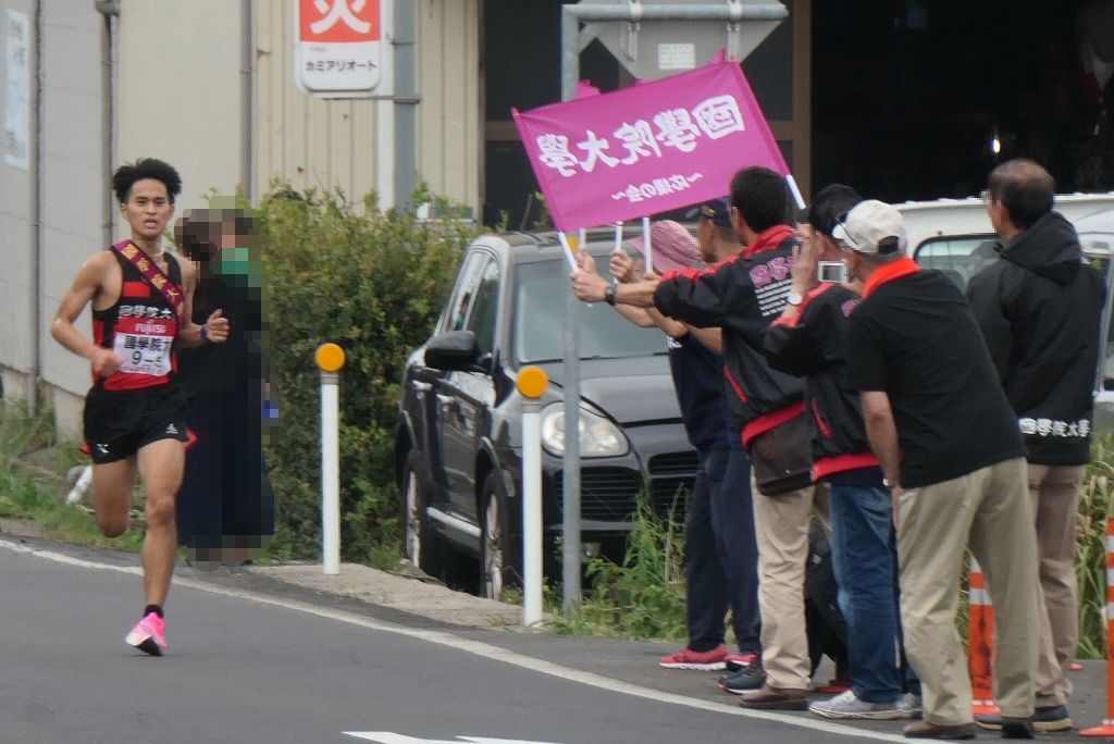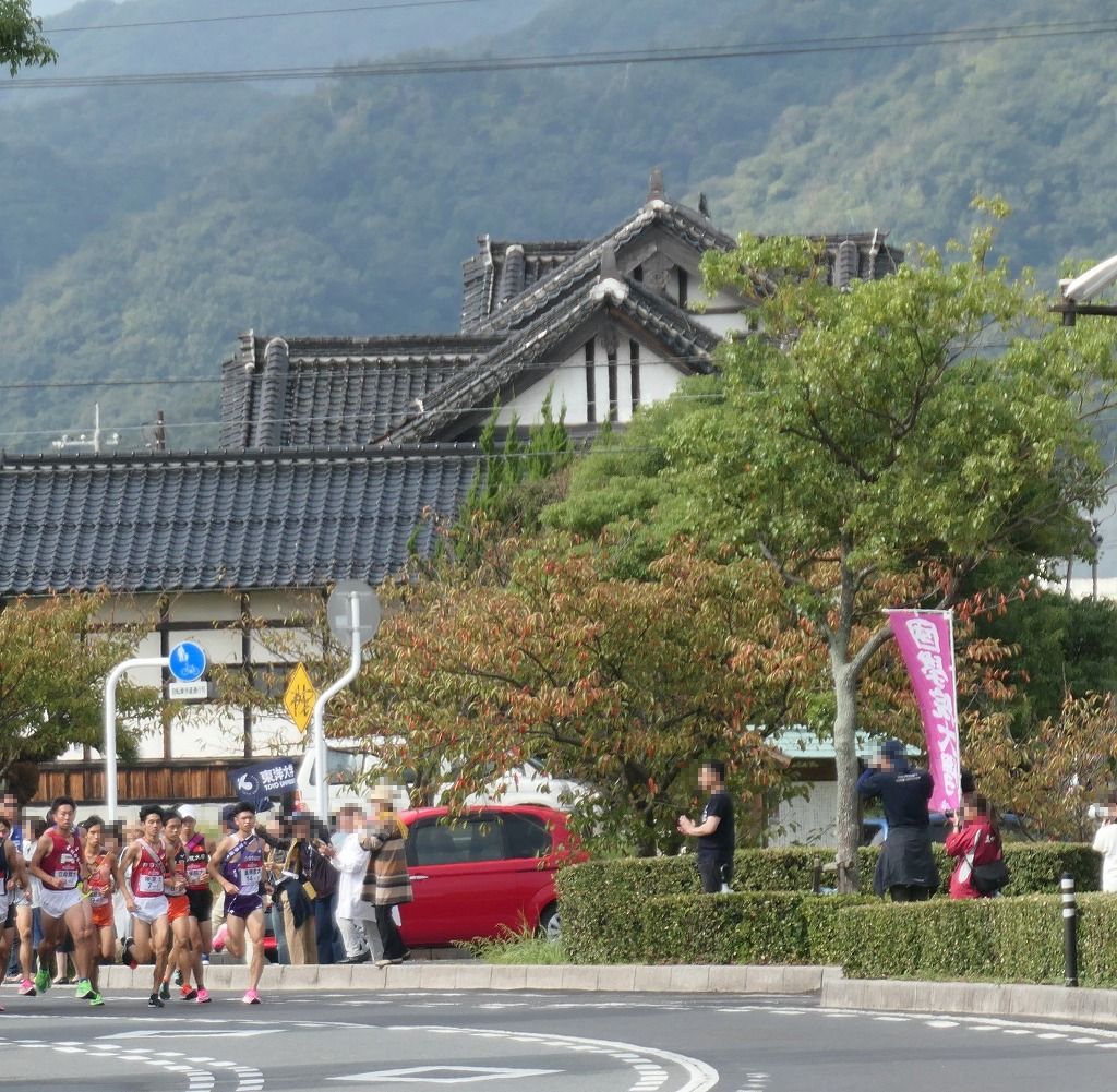 1区走者藤木選手の後ろに國學院の幟。その後方は旧大社駅、さらに出雲の山並。